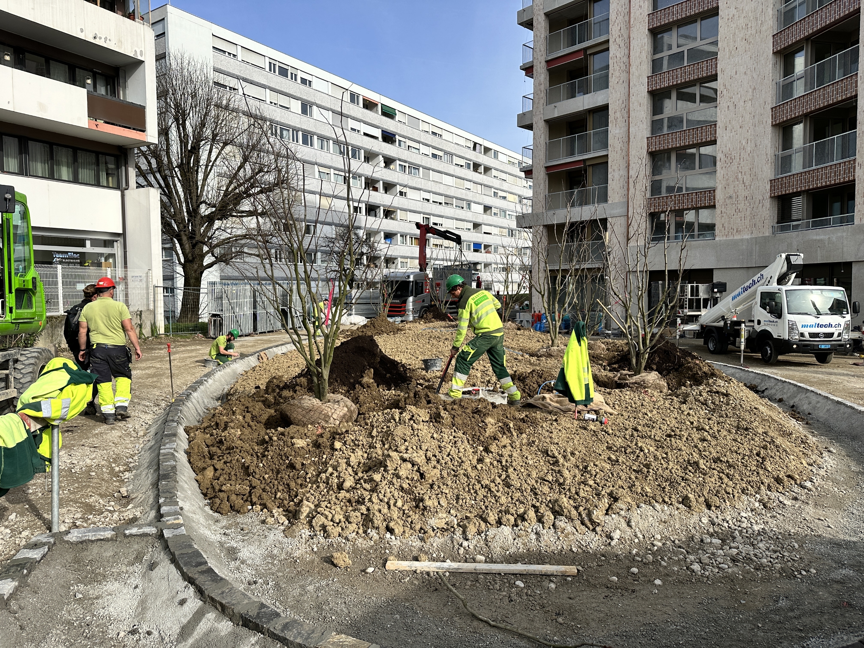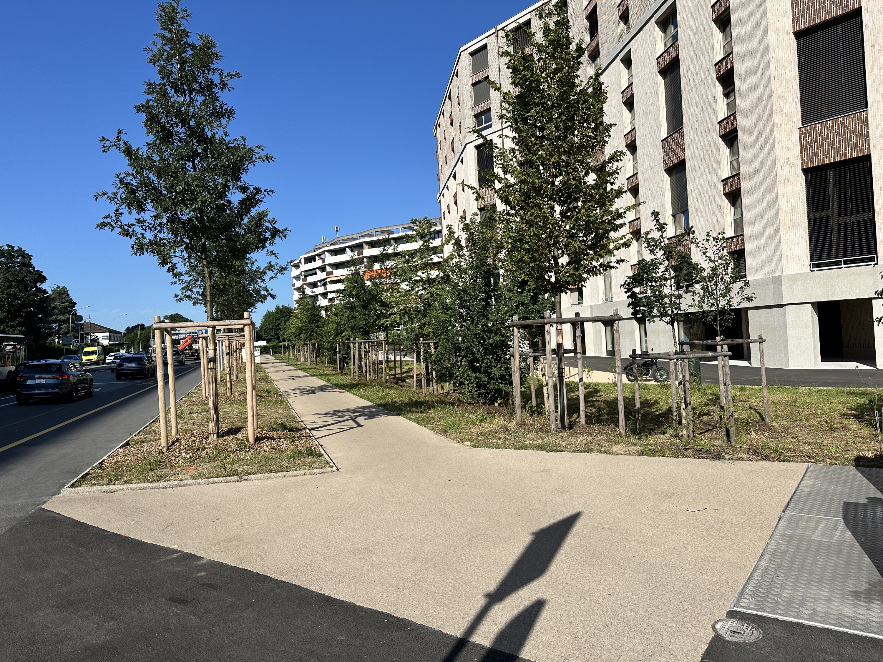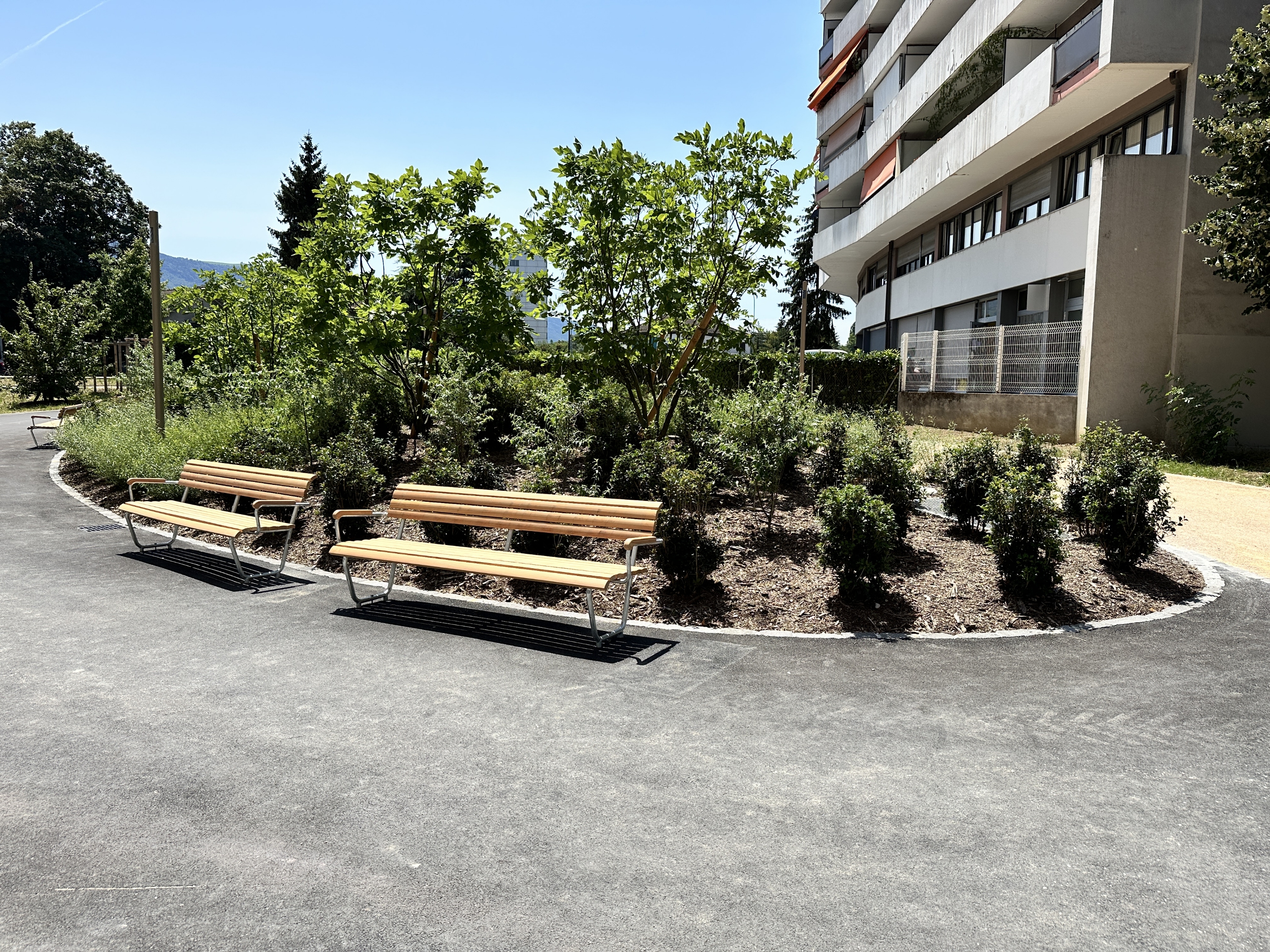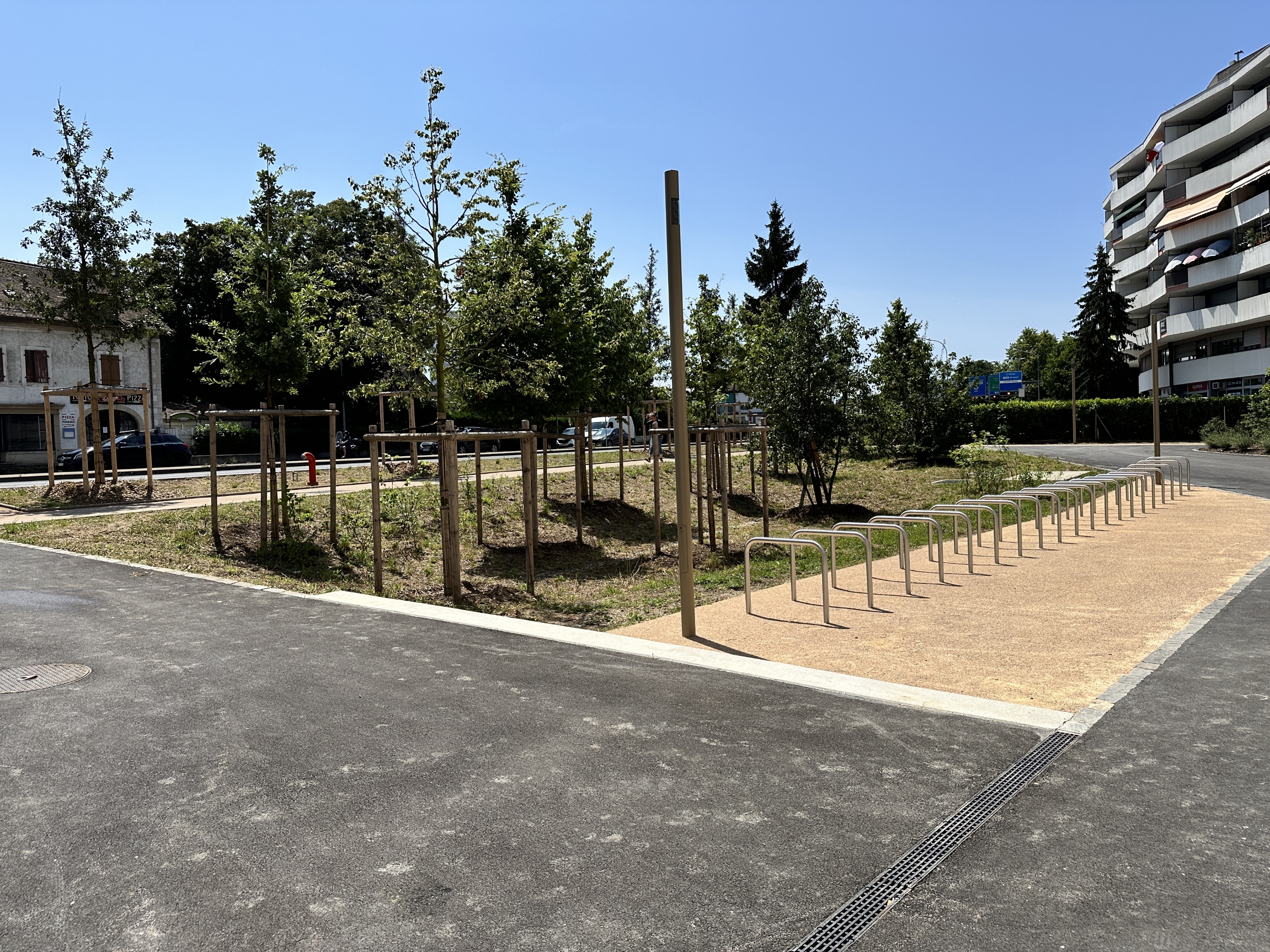 Travaux de plantation de 78 arbres, 1800 arbustes et 2350 vivaces. Nous avons semé 1850m² de prairie sèche dans les points hauts, de prairie humide dans les noues et de gazon fleuri. Afin de garantir les plantes nous entretenons pendant au moins deux ans à l'aide de l'arrosage intégré outils aujourd'hui indispensable à la reprise de grands arbres face aux récents épisodes de sècheresse estivale. Lancy est d'ailleurs l'une des première villes à avoir saisi l'importance de lutter contre les ilots de chaleur en ville et cette réalisation en est un bel exemple.