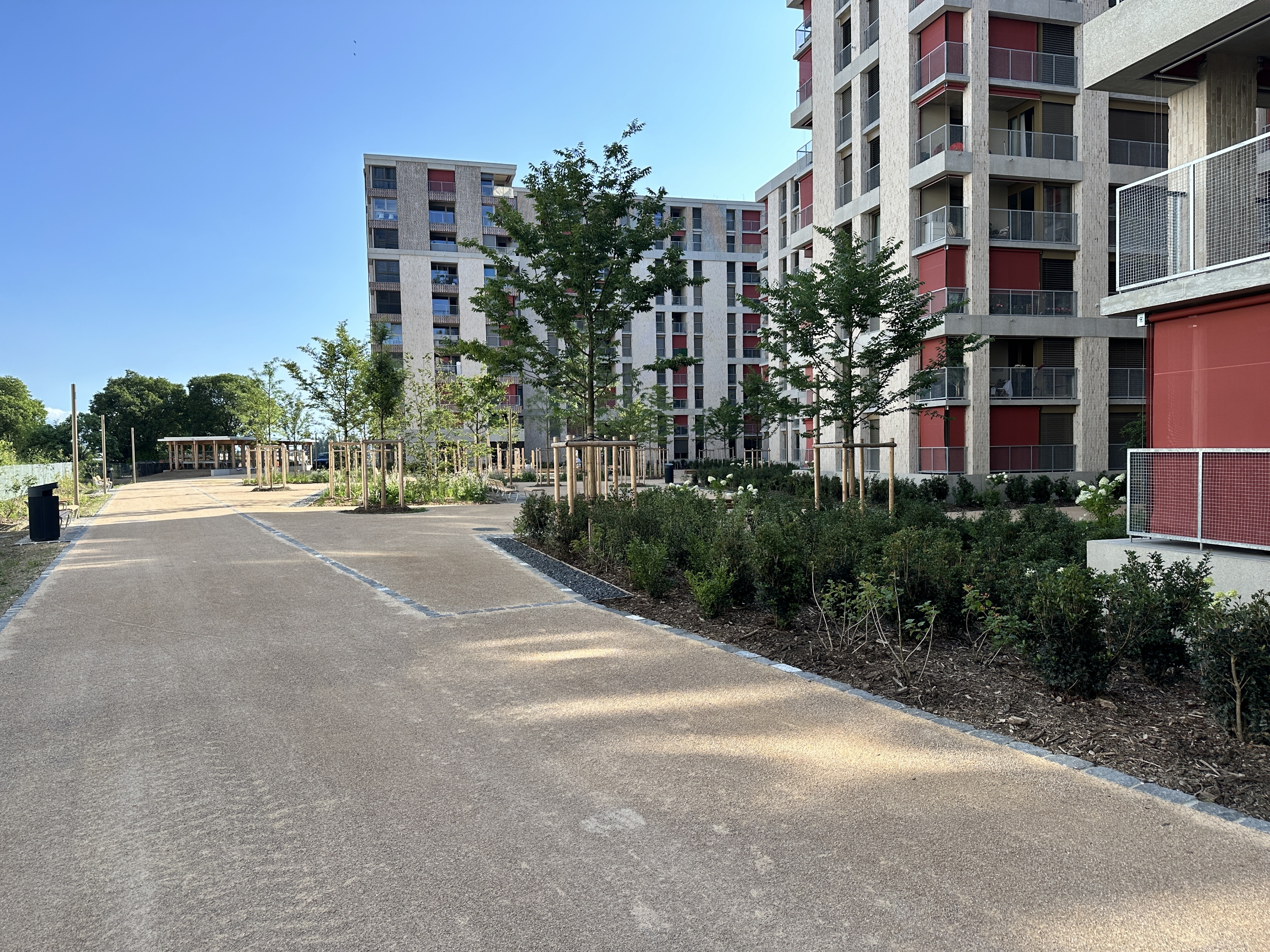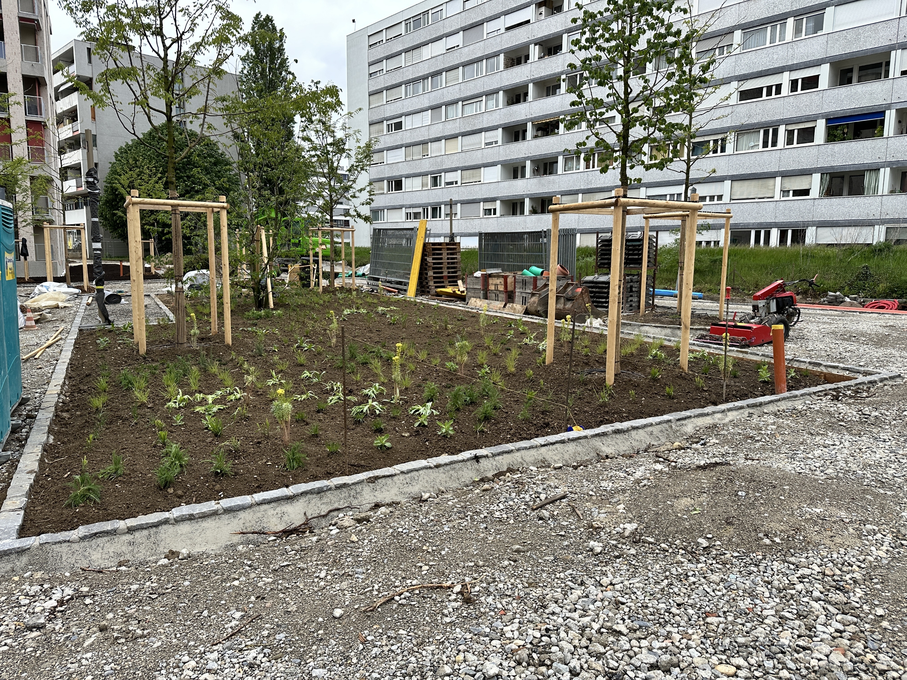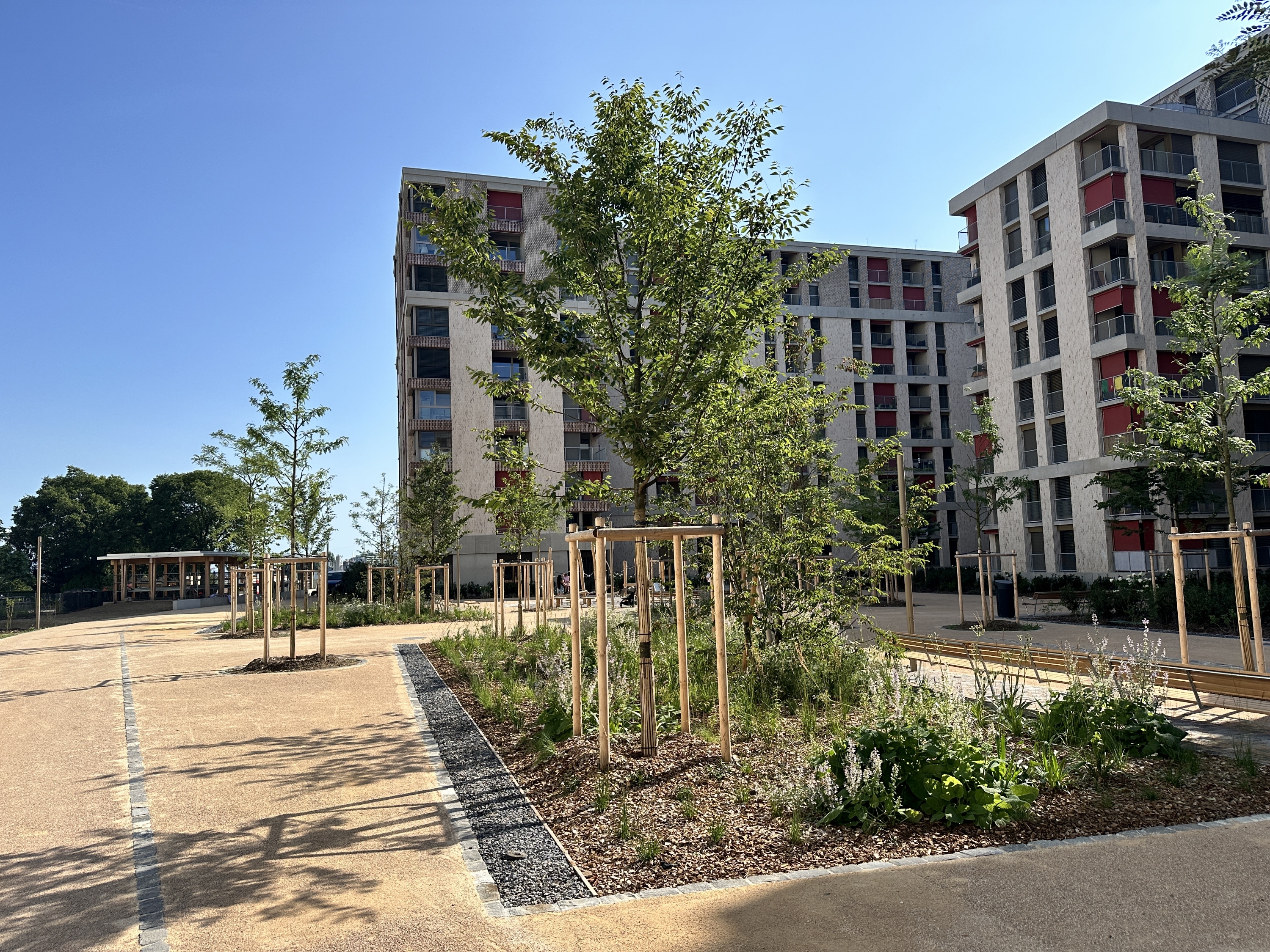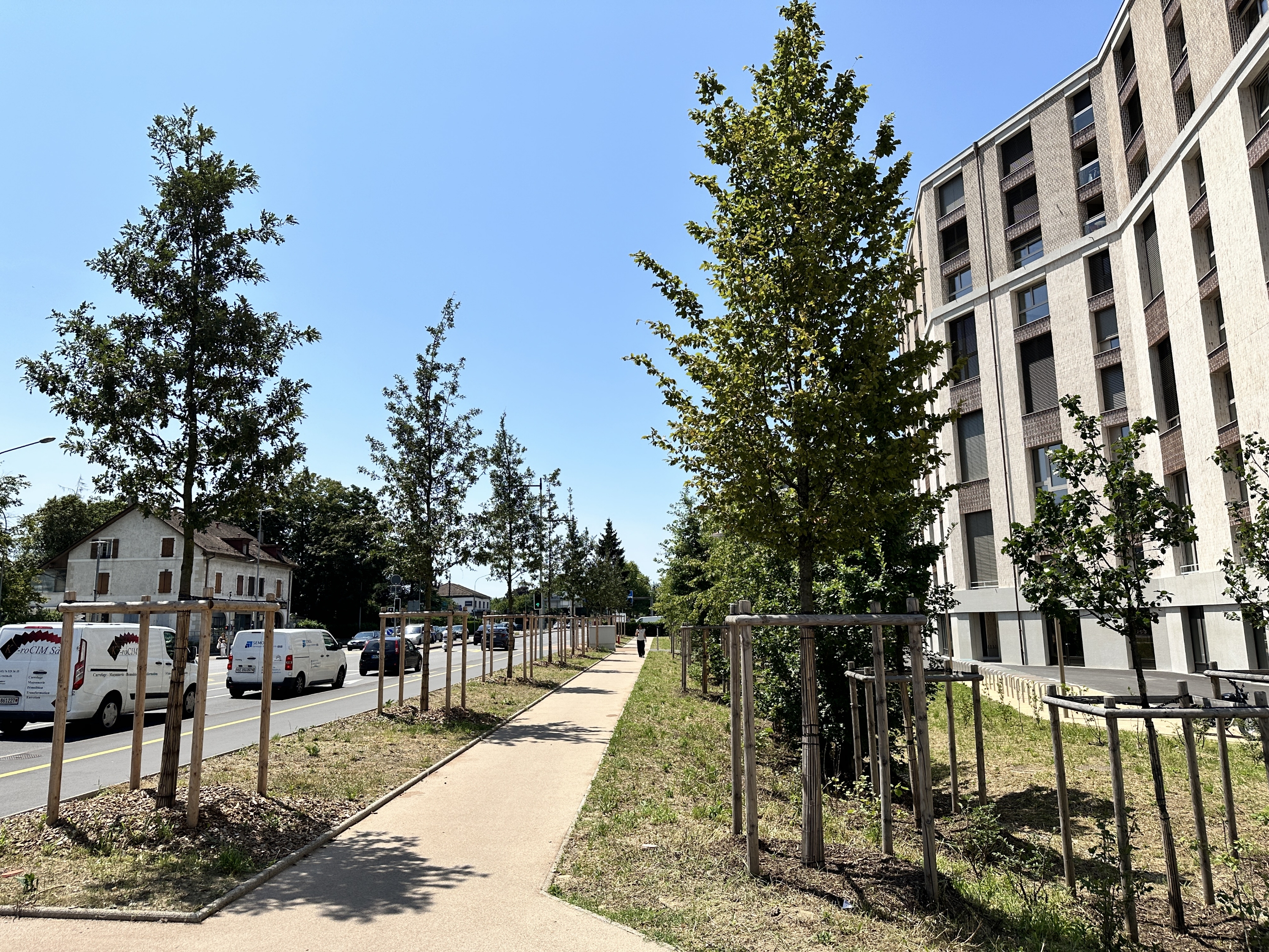 Travaux de plantation de 78 arbres, 1800 arbustes et 2350 vivaces. Nous avons semé 1850m² de prairie sèche dans les points hauts, de prairie humide dans les noues et de gazon fleuri. Afin de garantir les plantes nous entretenons pendant au moins deux ans à l'aide de l'arrosage intégré outils aujourd'hui indispensable à la reprise de grands arbres face aux récents épisodes de sècheresse estivale. Lancy est d'ailleurs l'une des première villes à avoir saisi l'importance de lutter contre les ilots de chaleur en ville et cette réalisation en est un bel exemple.