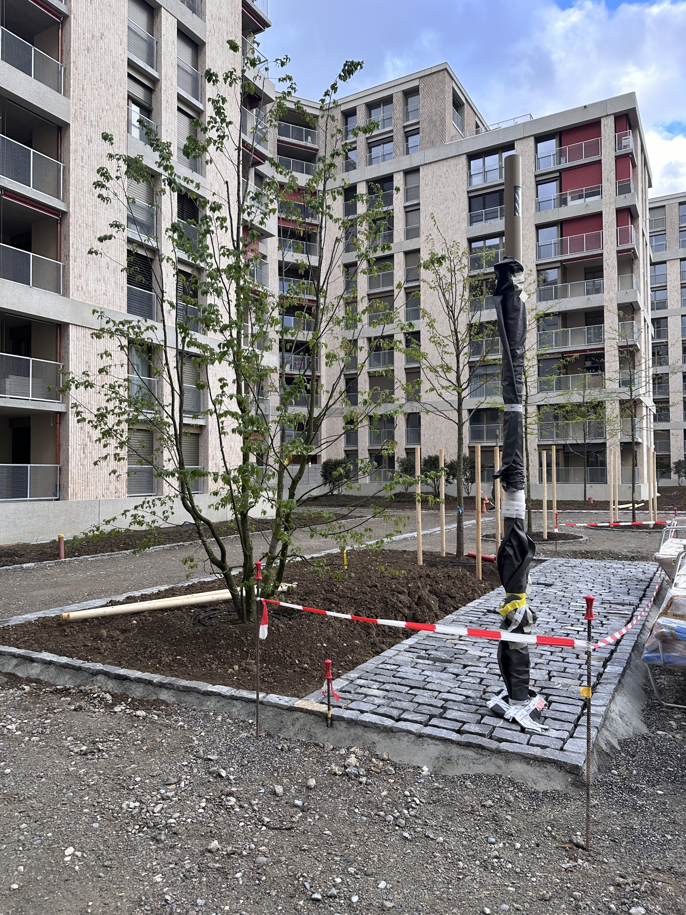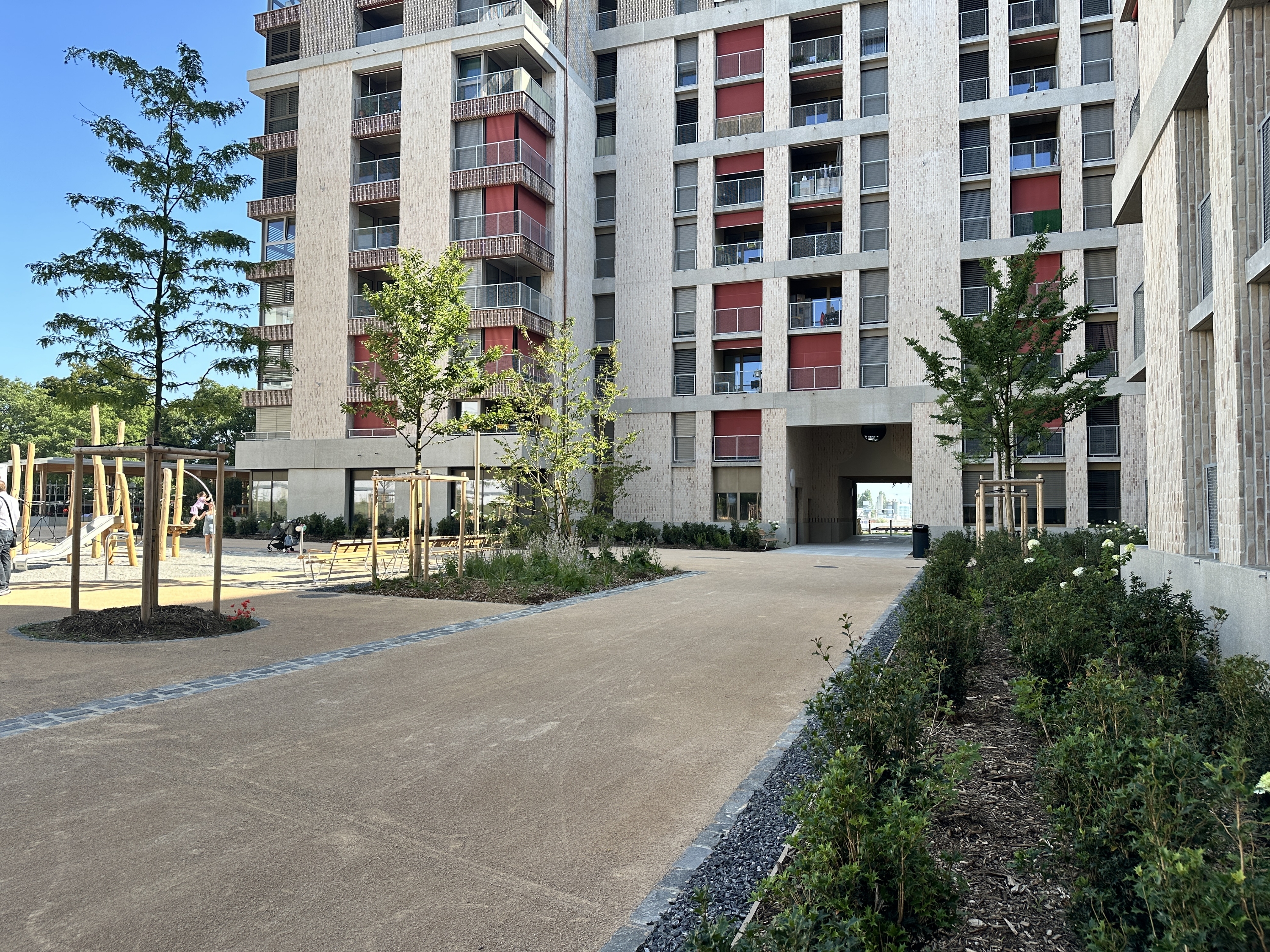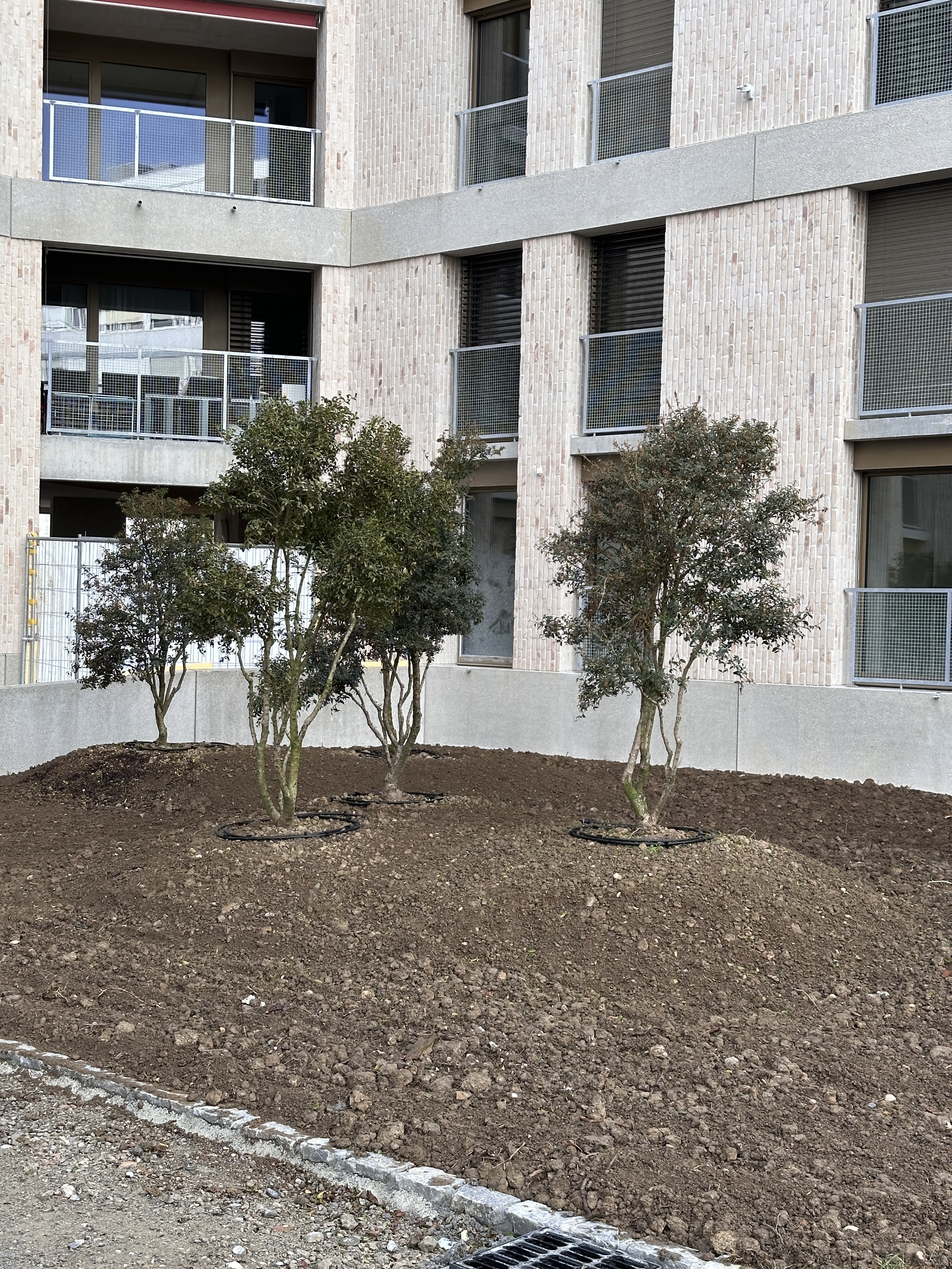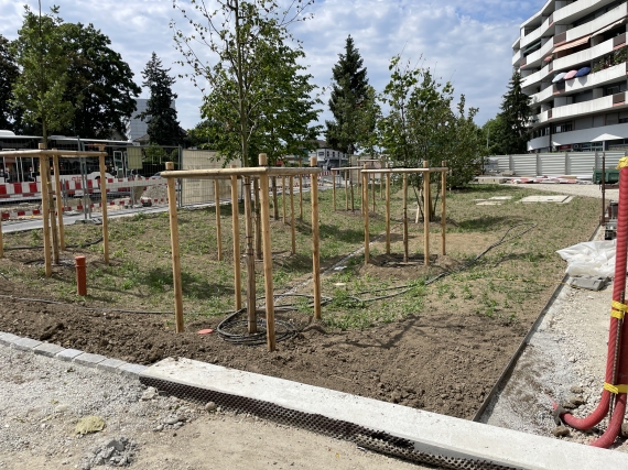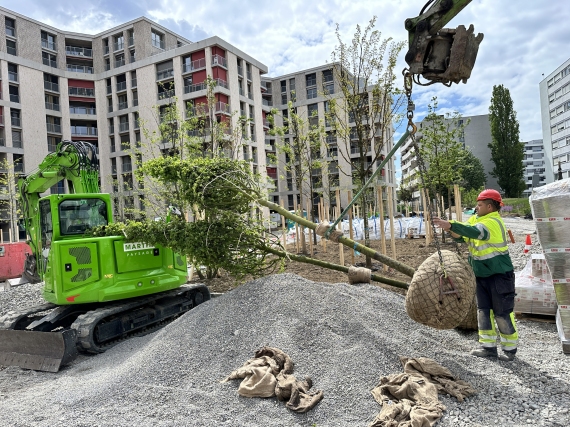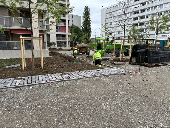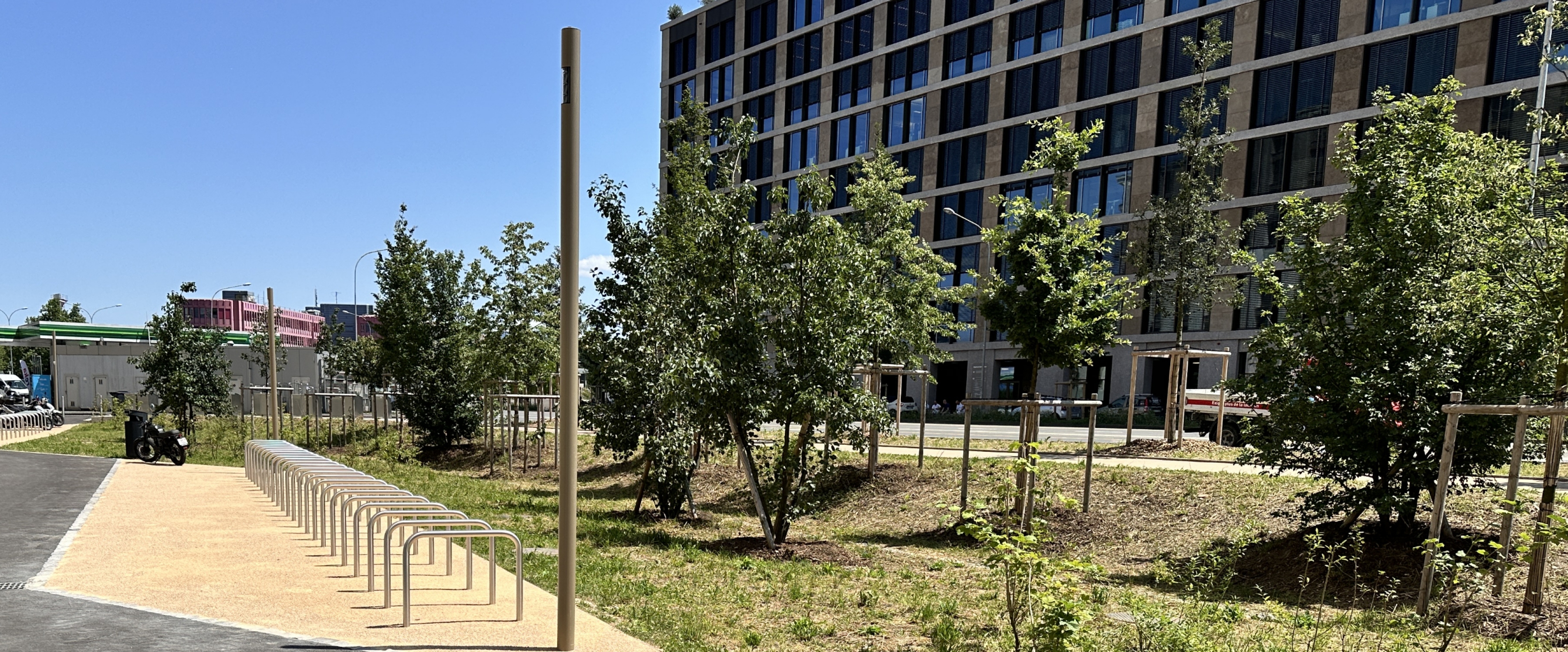 Travaux de plantation de 78 arbres, 1800 arbustes et 2350 vivaces. Nous avons semé 1850m² de prairie sèche dans les points hauts, de prairie humide dans les noues et de gazon fleuri. Afin de garantir les plantes nous entretenons pendant au moins deux ans à l'aide de l'arrosage intégré outils aujourd'hui indispensable à la reprise de grands arbres face aux récents épisodes de sècheresse estivale. Lancy est d'ailleurs l'une des première villes à avoir saisi l'importance de lutter contre les ilots de chaleur en ville et cette réalisation en est un bel exemple.