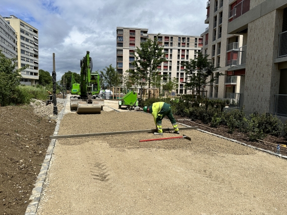 Les véhicules circuleront sur près de 3'000m² d'enrobés bitumineux et les piétons sur 2'800m² de matière calcaire stabilisée. L'équipe de maçonnerie a réalisé près de 2'000ml de bordures béton, de frises pavées et de voliges en acier, 350ml de muret en béton préfabriqué et 130m2 de dallage en béton coulé sur place.