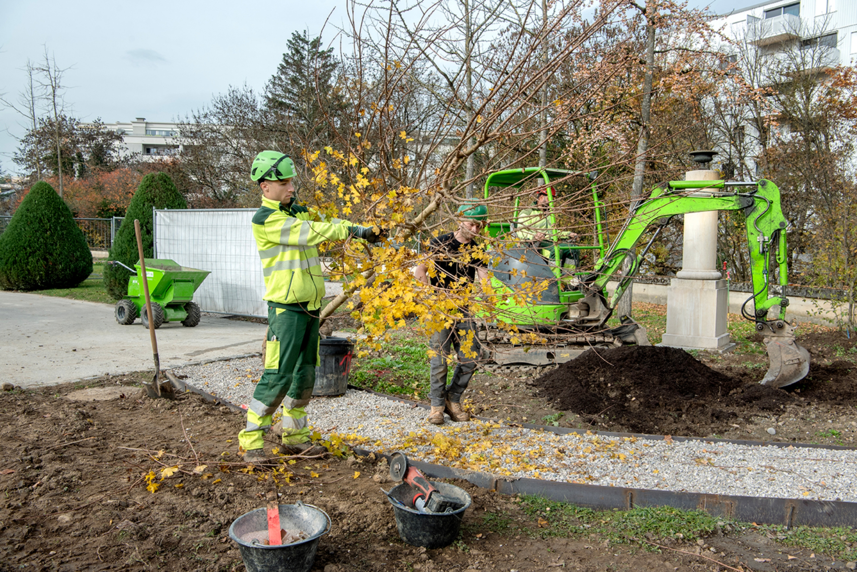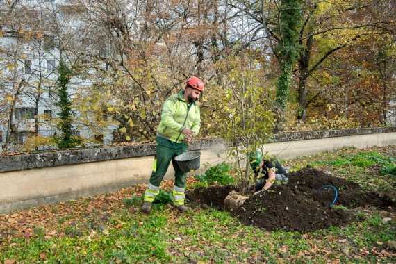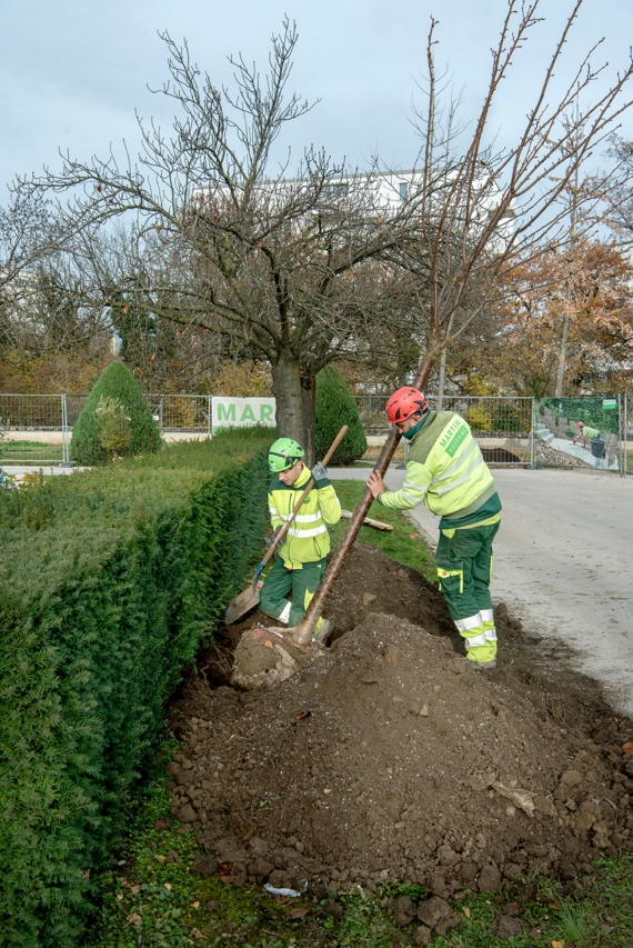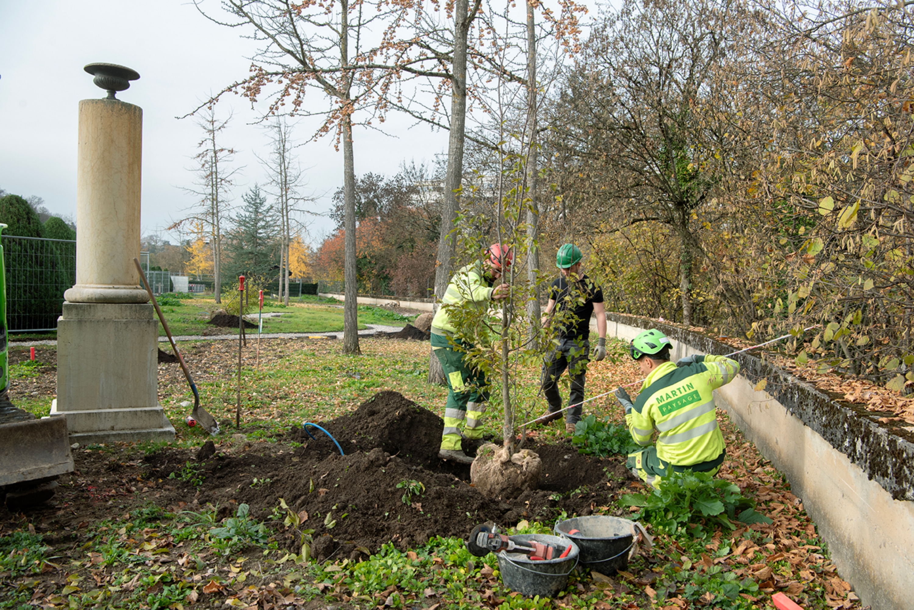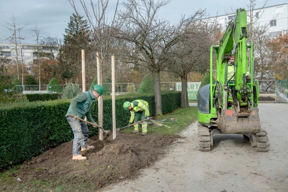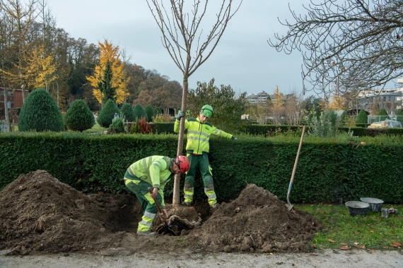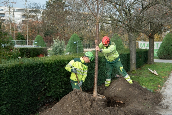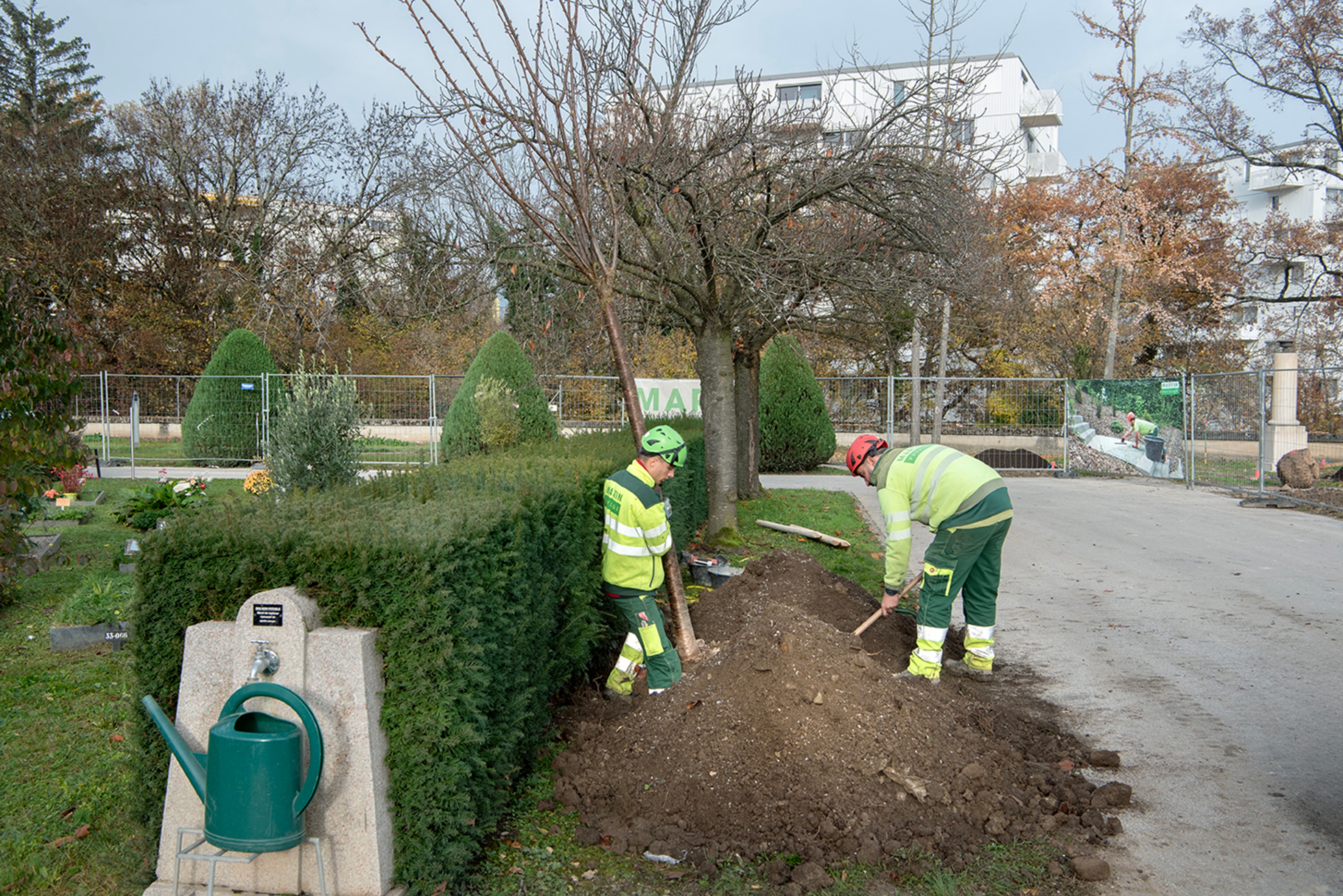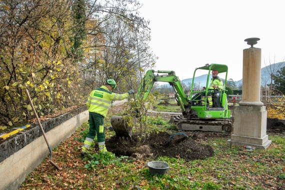 Ce cimetière emblématique de Carouge était peu végétalisé. Nous avons remplacé une grande partie des surfaces minérales par du gravier engazonné afin de maintenir l'accès au sépultures en tout temps. Des bordures métalliques séparent proprement les matériaux. L'importante quantité d'arbres planté accompagné de massif de vivaces transforme cet aménagement en ilot de fraicheur en été.