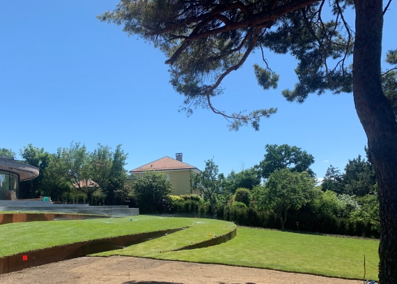Les espaces engazonnés sont réalisés grâce à des rouleaux pré-cultivés nécessitant une parfaite préparation du sol et une maîtrise de la technique de plaquage.