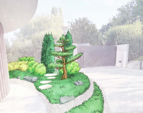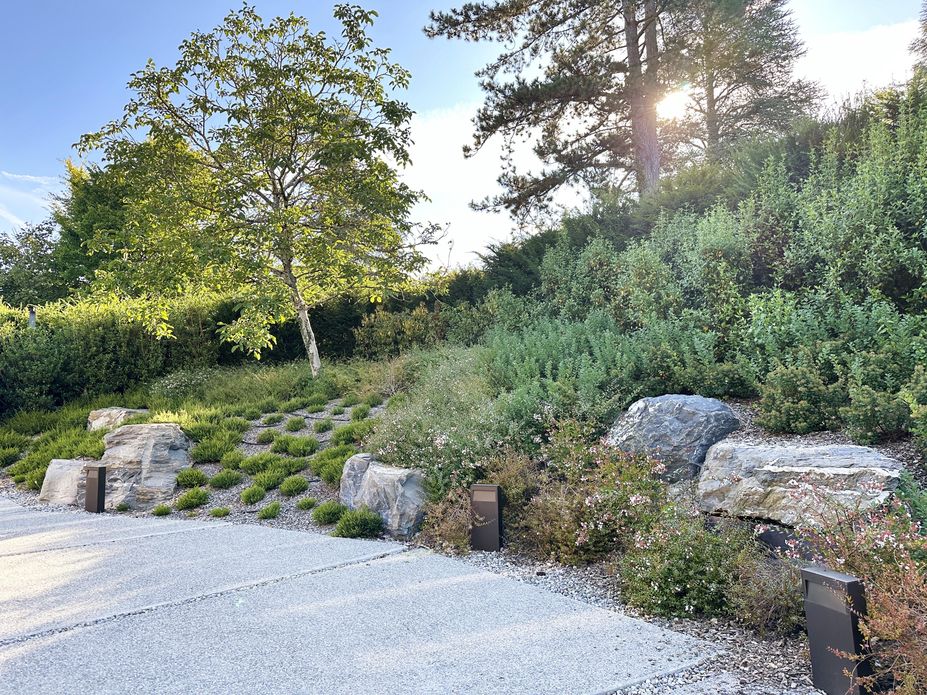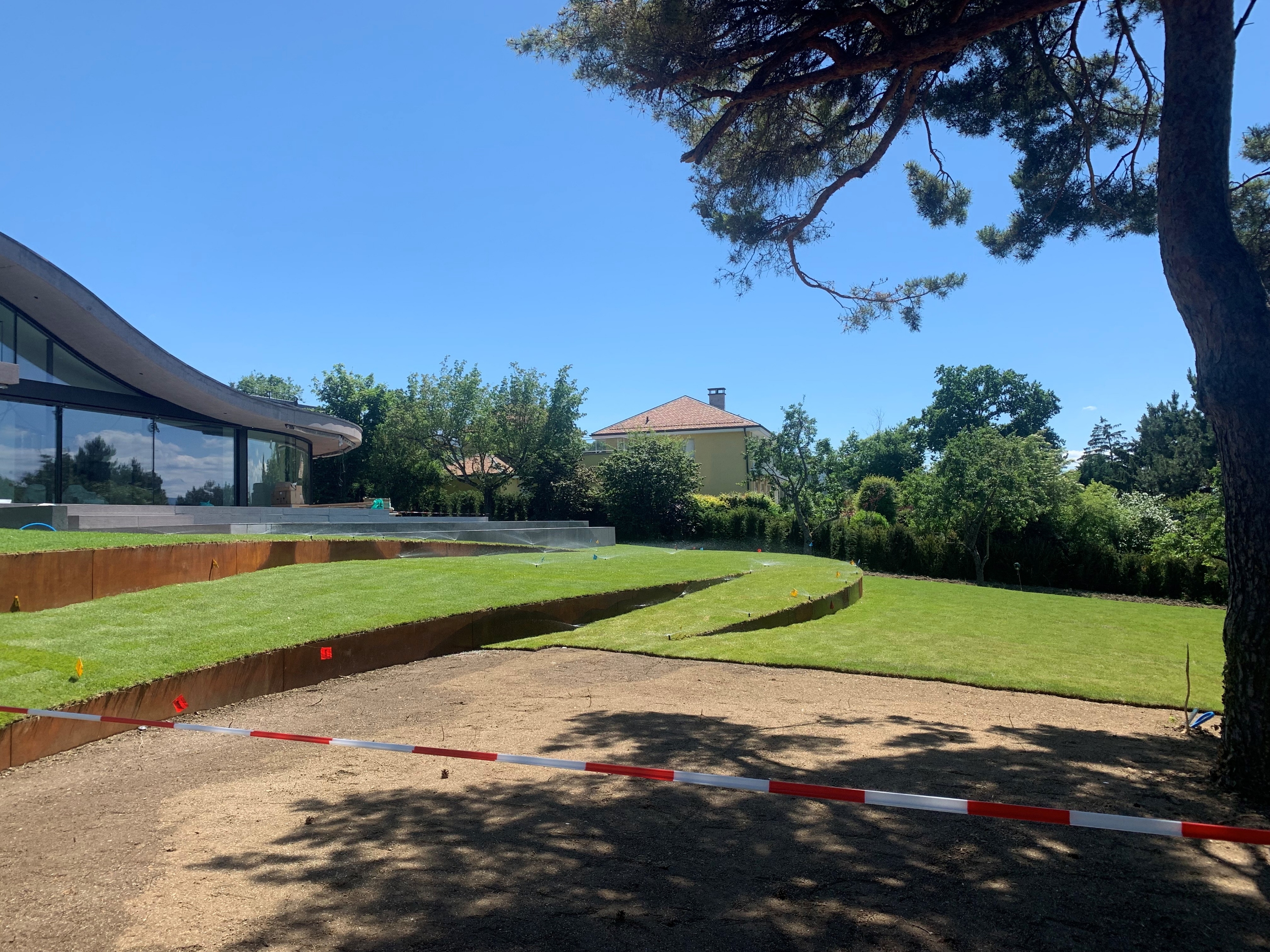 La réalisation de l'aménagement paysager dessiné par le bureau Oxalis architectes paysagistes associés Sàrl a été confiée à Martin Paysage. Les lignes du jardin font écho à l'architecture atypique et exceptionnelle de cette maison de standing.