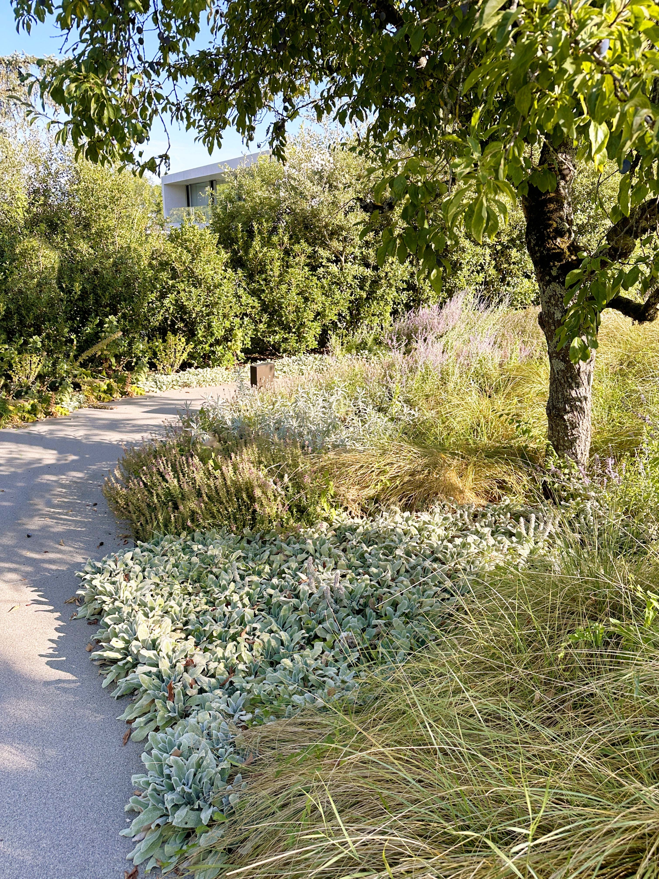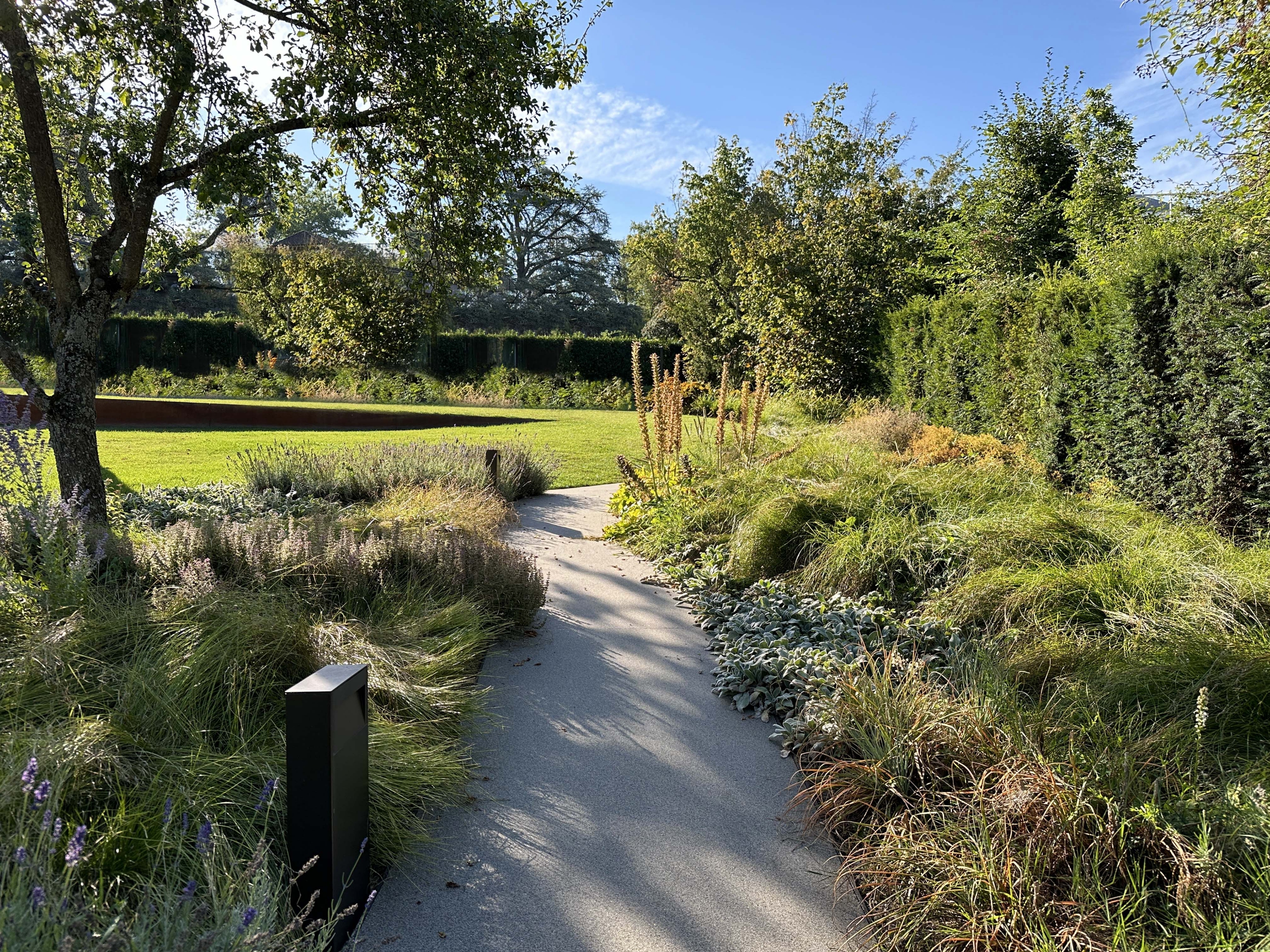 Des cheminements en revêtement stabilisé permettent de circuler harmonieusement entre les différentes ambiances paysagères. Les bordures métalliques, cintrées et soudées sur places, séparent finement le gazon des chemins.